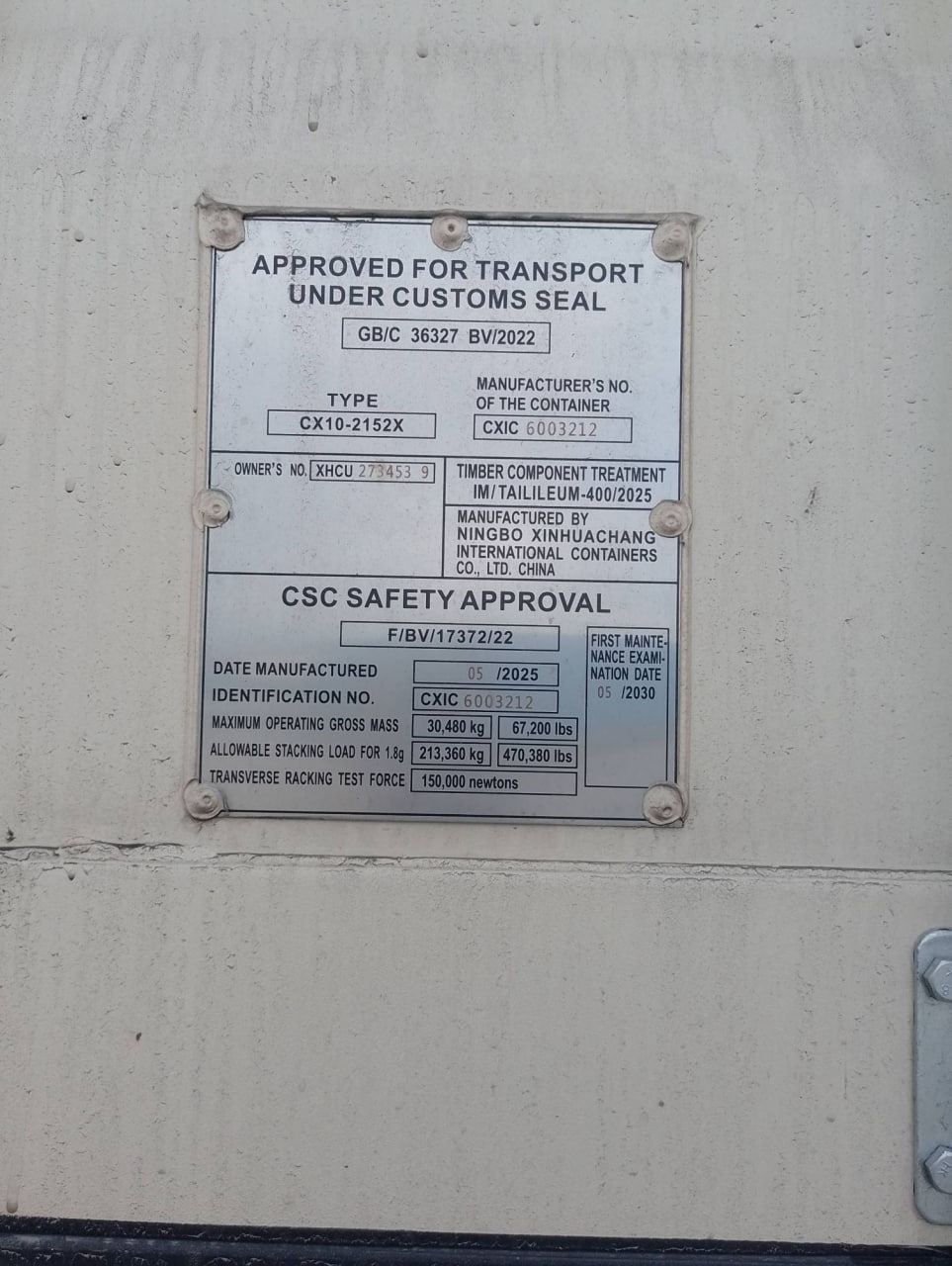 Identifikationsnummer: XHCU 273453 9