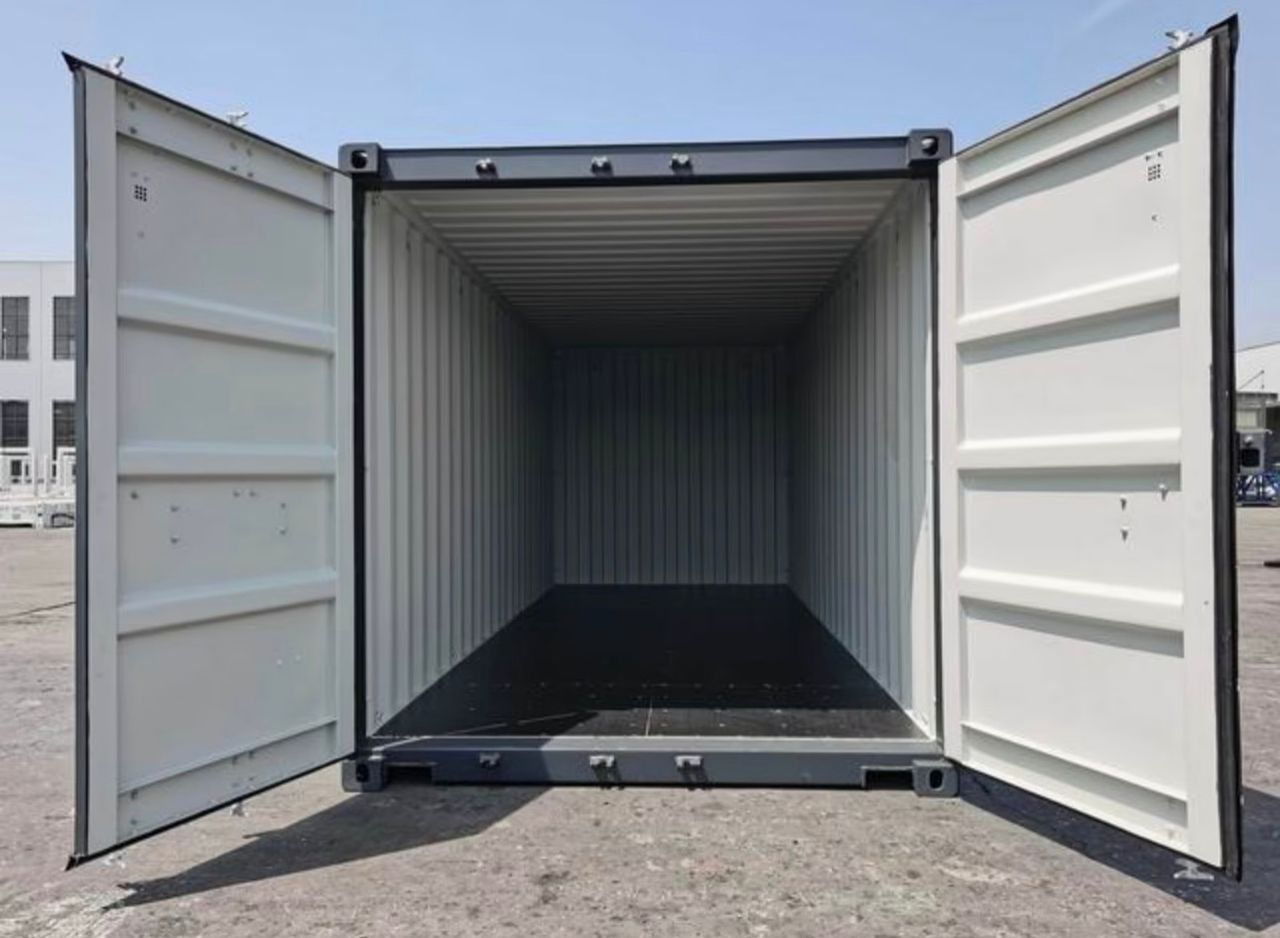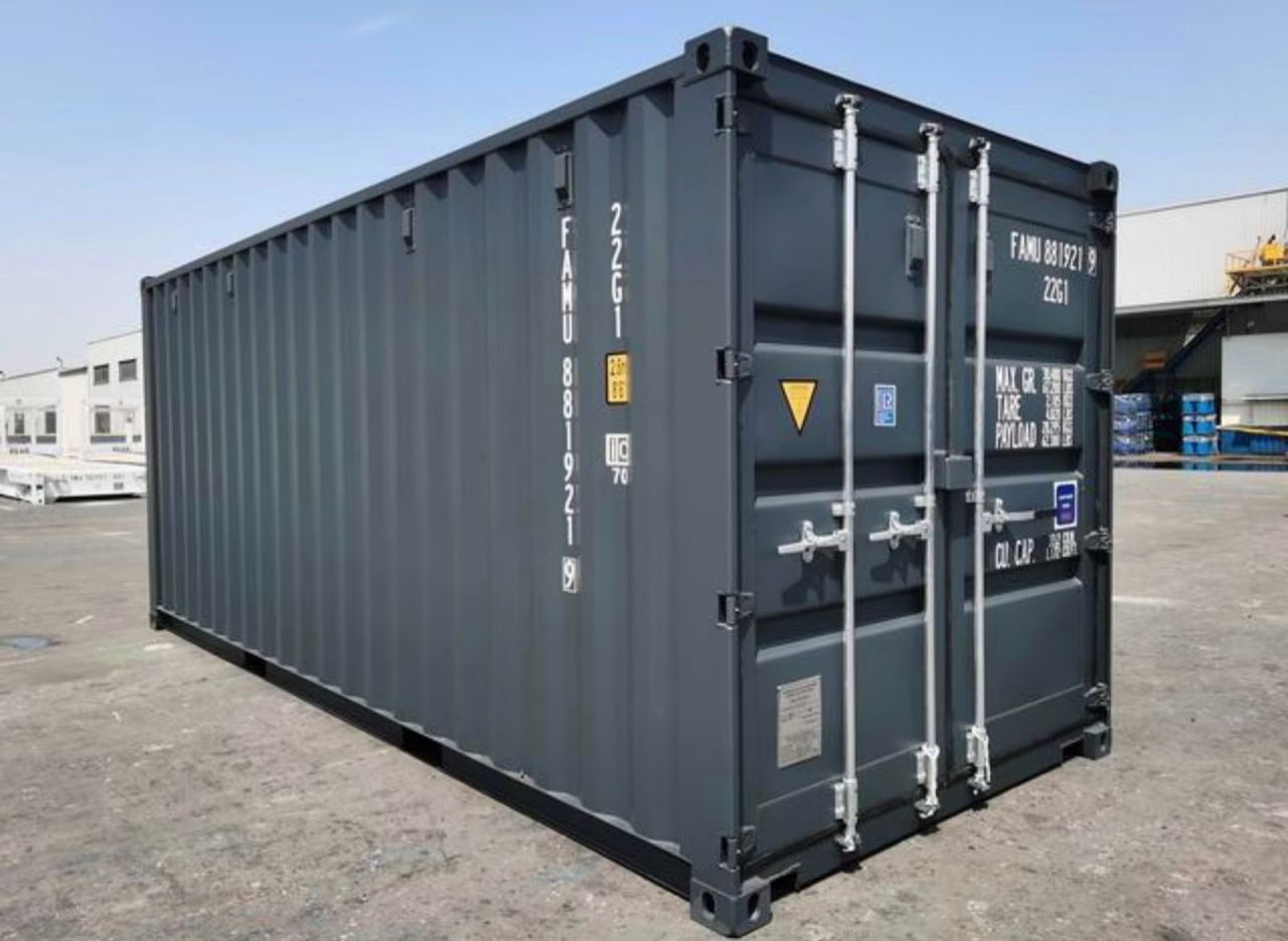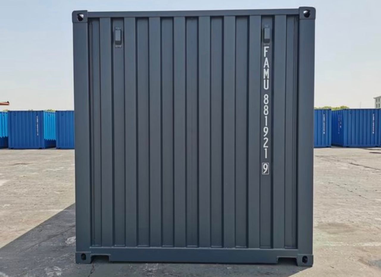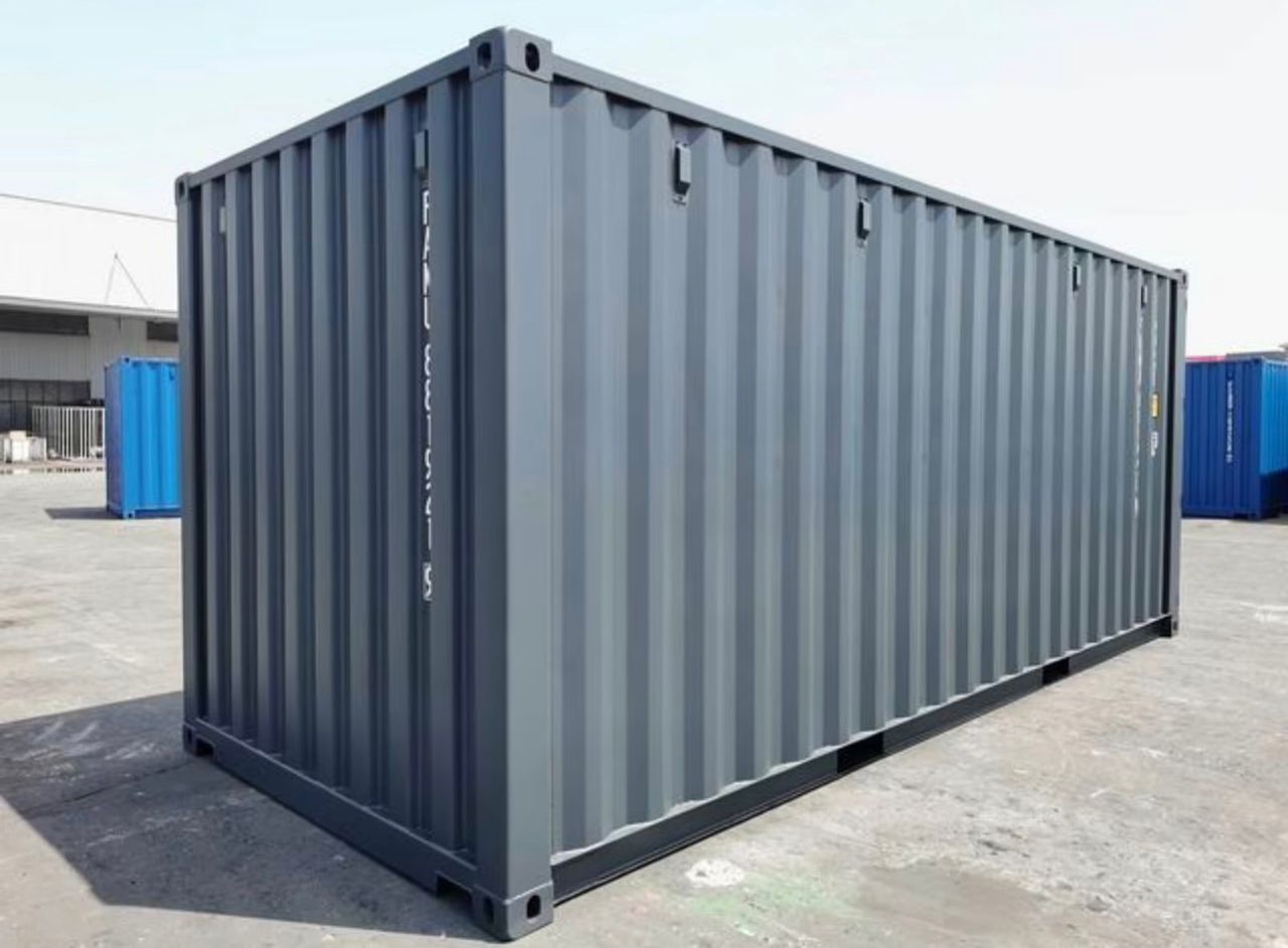 Nagelneuer 20-Fuß-Standardcontainer (Anthrazitgrau). Premium-„First Voyage“-Container mit Sicherheitsschließfach und 28 mm starkem, seewasserbeständigem Boden. Lloyd’s Register-zertifizierte Cortenstahlkonstruktion. Ideal für die sichere Lagerung von Wertgegenständen, den Export oder den modularen Umbau.