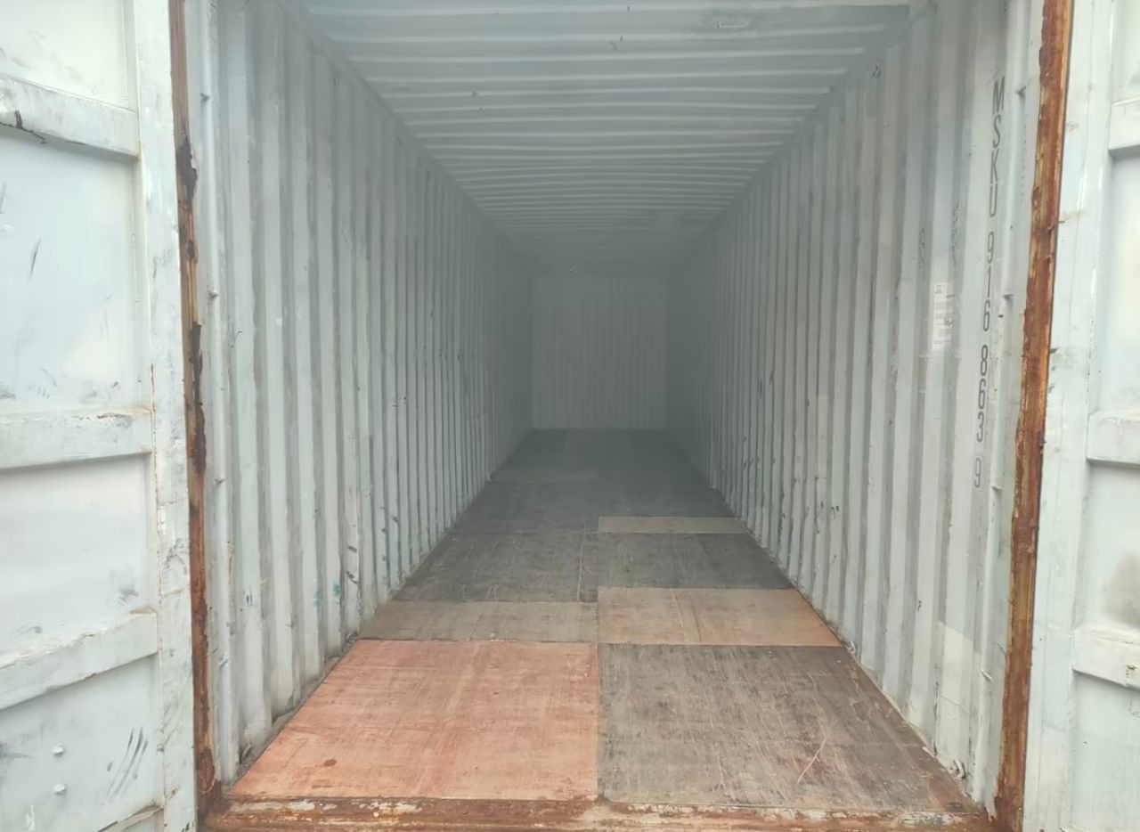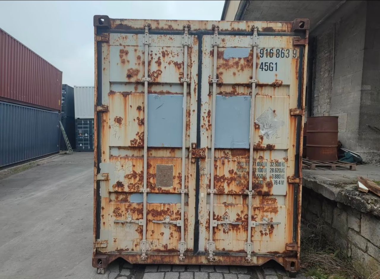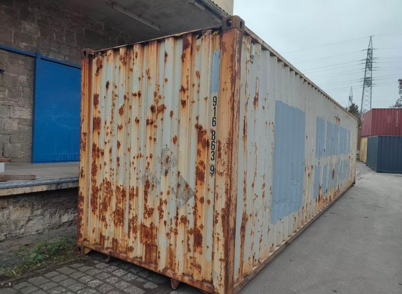 Dieser 45G1 (40′ High Cube) Container bietet dank seiner größeren Höhe ein größeres Lagervolumen als Standardcontainer. Obwohl er leichte Oberflächenkorrosion aufweist, ist seine Struktur robust und ideal für die stationäre Lagerung oder industrielle Anwendungen geeignet.